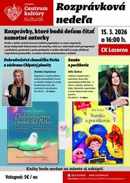 Před 6 dnyROZPRÁVKOVÁ NEDEĽA v CK Lozorno📅 15.3.2026 o 16:00 hod. 🏠 Centrum kultúry a vzdelávania Lozorno 👉Rozprávky, ktoré budú deťom čítať samotné autorky 📚!👈 📌 Milé rodinky! Príďte s deťmi stráviť čarovné nedeľné popoludnie vo svete rozprávok. Svoje knihy 📖 budú čítať priamo ich autorky a deti sa s nimi budú môcť porozprávať o príbehoch, postavách a počas podujatia si môžu nakresliť🖍️ aj svoju obľúbenú rozprávkovú postavičku. A možno stretnú aj kamarátov z knižiek. 📚 Natália Dujničová 🖋️ ⭐️ DOBRODRUŽSTVÁ CHUMÁČIKA PERKA A ZÁCHRANA CHLPATEJ PLANÉTY Napínavý a veselý príbeh o malom chumáčikovi, ktorý sa odváži vystúpiť zo svojej komfortnej zóny, aby zachránil svoju planétu. Pre deti 5 – 10 rokov. 📚 Ellie Šedivá 🖋️ ⭐️SAMKO A POCITKOVIA Láskavé rozprávanie o emóciách, ktoré deti sprevádzajú každý deň – o hneve, smútku, radosti aj láske. Spoločné rozprávanie a hravé objavovanie sveta pocitov. Pre deti 3 – 5 rokov. Knihy bude možné si na mieste aj zakúpiť. 📍Vstupné: 5€/os
