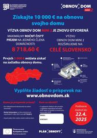 Práve prebieha 3. kolo výzvy "Obnov dom mini 2", do ktorej sa môžete zapojiť. Na stránke obnovdom.sk nájdete všetky informácie o tom, aké podmienky je potrebné spĺňať na získanie finančných prostriedkov. Žiadosti bude možné podávať od 17.3.2025 do 22.4.2025