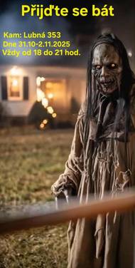 Zveme na Strašidelnou stezku, která se bude konat ve dnech 31.10.-2.11.2025, vždy od 18:00 do 21:00 hod., na adrese Lubná 353.