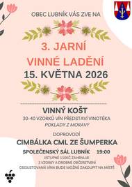 Obec Lubník Vás srdečně zve na 3. ročník Jarního vinného ladění, které se uskuteční 15.5.2025. Od 19:00 proběhne na společenském sále v Lubníku za doprovodu cimbálové muziky CML ze Šumperka vinný košt vinotéky POKLADY Z MORAVY. Cena vstupenky je 150 Kč. V ceně vstupného je degustace 3 vzorků vína a drobné občerstvení. Na místě je možné dále zakoupit degustovaná vína. Z důvodu velkého zájmu o akci bude probíhat PŘEDPRODEJ VSTUPENEK. Vstupenky si můžete zakopit v úředních hodinách na OU v Lubníku, nebo kdykoliv po telefonické domluvě se starostou obce (mob.: 724 189 791). PŘÍMO NA MÍSTĚ BUDE MOŽNO ZAKOUPIT VSTUPENKY NA DEGUSTACI POUZE, POKUD NEBUDE NAPLNĚNA KAPACITA SÁLU Z PŘEDPRODEJE!