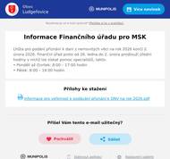 Lhůta pro podání přiznání k dani z nemovitých věcí na rok 2026 končí 2. února 2026. Finanční úřad proto od 26. ledna do 2. února prodlouží úřední hodiny v nichž lze získat pomoc specialistů, takto:• Pondělí až čtvrtek: 8:00 – 17:00 hodin• Pátek: 8:00 – 14:00 hodin.