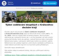 Dovolte, abych vás pozvala na Týden vzdělávání dospělých v Královéhradeckém kraji, který se letos bude konat v týdnu od 3. – 7. 11. 2025. I letos se můžete těšit na bohatý program. Akce se budou odehrávat jak v prezenční formě, tak i v on-line prostředí, což vám umožní poslouchat témata, která vás zajímají, z pohodlí domova nebo z kanceláře. Některé akce budou i nahrávané, takže bude možné si je přehrát i zpětně. Některé akce ale vyžadují registraci, proto dlouho neotálejte a přihlaste se, neboť některé semináře mají limit na maximální počet přihlášených. Semináře nejsou akreditované. Zde zasílám odkaz na webové stránky, kde jsou vyfiltrované všechny přednášky: Vzdělávací akce | Týden vzdělávání dospělých v Královéhradeckém kraji Dle filtru si můžete zadat, zda preferujete on-line nebo prezenční akce. Doporučuji on-line: Cvičení s Ivou Kufr – celý týden vždy od 9:00 – 10:00 Umělá inteligence – rizika a příležitosti Seznamte se s aplikací Můj život po škole – 4.11. a 5.11. Vánoce v české rodině Koučování, komunikace, konflikt a mediace – čtyři pilíře porozumění a řešení Zdraví ve vlastních rukou: jednoduché kroky, jak předejít nemocem Homesharing - Tam, kde Váš čas pomáhá Poklady ukryté v příbězích našich předků II.: Praktická genealogie od archivních základů po nástroje AI Polyvagální teorie - aneb jak porozumět svému nervovému systému a vědomě s ním pracovat Jak na laskavou řeč - když slova tvoří mosty, ne zdi Budu ráda i za případnou zpětnou vazbu, jak se vám kurz a jeho organizace líbila. S pozdravem Bc. Klára Stannerová odbor regionálního rozvoje, grantů a dotací Krajský úřad Královéhradeckého kraje Pivovarské náměstí 1245│500 03│Hradec Králové mobil: 722 954 667 e-mail: klstannerova@khk.cz www.khk.cz Vstřícný, rychlý a profesionální úřad – spokojený občan.