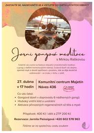 Před 28 dnyJarní gongová meditaceSrdečně zveme všechny občany na Jarní gongovou meditaci s Mirkou Raškovou, která se uskuteční v pondělí 27. dubna 2026 od 17:00 v Komunitním centru Majetín. Rezervace: Jarmila Fleissigová, tel. 602 578 963 Příspěvek: 400 Kč dospělí, 200 Kč děti a ZTP Jarní gongová meditace, Majetín 2026