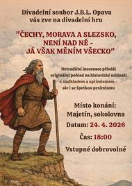 Před 26 dnyDivadelní hra souboru J.B.L. OpavaDivadelní soubor J.B.L. Opava Vás zve na divadelní hru "ČECHY, MORAVA A SLEZSKO, NENÍ NAD NĚ - JÁ VŠAK MĚNÍM VŠECKO" v pátek 24. dubna 2026 od 18:00 hodin v sokolovně Majetín. Vstupné dobrovolné. Divadlo J.B.L. Opava 2026