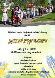 Před 15 dnyJarní slavnostFolklorní soubor Majetínek srdečně zve všechny na tradiční JARNÍ SLAVNOST Přijďte s námi přivítat jaro v úterý 7. dubna 2026. Sraz účastníků je v 16:30 u kašny na návsi. Těšit se můžete na: krojovaný průvod směrem ke Komunitnímu centru (dvůr) slavnostní vítání jara dětské hry a taneční program vystoupení dětského i dospělého folklorního souboru Majetínek drobné občerstvení Přijďte si užít příjemné odpoledne plné tradic, hudby a dobré nálady. Těšíme se na vaši účast!