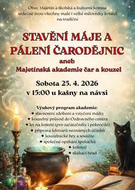 Před 5 dnySTAVĚNÍ MÁJE A PÁLENÍ ČARODĚJNICObec Majetín a školská a kulturní komise srdečně zvou všechny malé i velké milovníky kouzel v sobotu 25. dubna 2026 od 15:00 u kašny na návsi na tradiční STAVĚNÍ MÁJE A PÁLENÍ ČARODĚJNIC aneb Majetínská akademie čar a kouzel. Stavění máje a pálení čarodějnic 2026