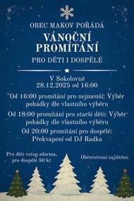 Obec Makov pořádá VÁNOČNÍ PROMÍTÁNÍ pro děti i dospělé. V Sokolovně v neděli 28.12.2025 od 16 hodin. Od 16 hodin promítání pro nejmenší. Od 18 hodin promítání pro starší děti. Od 20 hodin promítání pro dospělé s filmovým překvapením od DJ Radka. Pro děti vstup zdarma, pro dospělé 50Kč. Občerstvení zajištěno