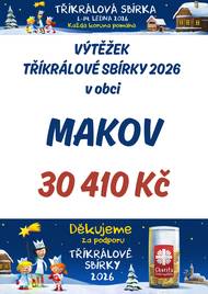 Děkujeme Všem občanům za podporu TŘÍKRÁLOVÉ SBÍRKY v Makově 2026. Poděkování patří i Marušce a Vítkovi Foglovým a jejich koledníkům za to, že se jim v naší obci podařilo vybrat krásných 30 410Kč. Děkujeme, že pomáháte nám pomáhat. Farní charita Litomyšl.