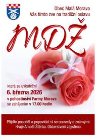 Obec Malá Morava Vás tímto zve na tradiční oslavu MDŽ, která se uskuteční 6. března 2026 v pohostinství Farmy Morava se zahájením v 17:00 hodin. Přijďte posedět a popovídat si se sousedy a známými. Hraje Arnošt Štěrba. Občerstvení zajištěno
