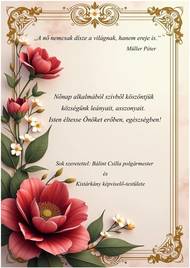 Před 1 měsícemNőnapi köszöntőNőnap alkalmából szívből köszöntjük községünk leányait, asszonyait. Isten éltesse Önöket erőben, egészségben! Sok szeretettel: Bálint Csilla polgármester és Kistárkány képviselő-testülete
