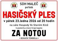 SDH Maleč vás srdečně zve na ples, který se koná v pátek 23.1.2026 od 20h na sále Hospody ve starém kině. Od 17:30h bude v hospodě otevřená zvěřinová kuchyně, kde si můžete pochutnat na řízcích, guláši a pečených žebrech.
