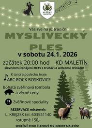 Vážení přátelé, srdečně vás zveme na myslivecký ples do Maletína. Přípravy jsou v plném proudu, těšíme se na vaší účast.