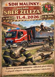 Sbor dobrovolných hasičů Malínky pořádá v sobotu dne 11.04.2026 sběr železného šrotu v obci Malínky. Sběr proběhne v době od 8:30 hod.. Železo umístěte viditelně před dům.