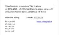 Vážení pacienti, MUDr. Krivošíková Vám oznamuje, že v čase od 29. decembra 2025 do 6.1.2026 nebude ordinovať. Akútne stavy ošetrí ambulancia Rodinný doktor, Jánošíkova 7/B v Senci v rámci ordinačných hodín.