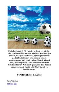 ⚽️ Fotbalový oddíl 1. FC Netolice srdečně zve všechny děti od 5 let! ⚽️ 🗓️ Začínáme 1. září 2025 🕓 Každé pondělí od 16:00 hod. 📍 Místo: Fotbalové hřiště v Netolicích Kontakt: Josef Vojtěšek, tel: 722 921 849