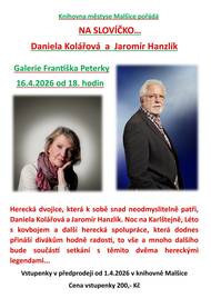 Vážení občané, od středy 1.4.2026 si můžete zakoupit v knihovně městyse Malšice vstupenku na setkání s Danielou Kolářovu a Jaromírem Hanzlíkem, které se uskuteční 16.4.2026 v Galerii Františka Peterky.