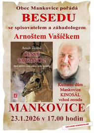 👉 Pozvánka na 21. zastupitelstvo obce 22.1.2026 Vážení občané, Obec Mankovice vás zve na 21. zasedání Zastupitelstva Obce Mankovice, které se koná ve čtvrtek 22.1.2026 v 17.00 hodin v kinosále Kulturního domu Mankovice. PROGRAM: 1. Určení ověřovatelů zápisu a jmenování zapisovatele 2. Schválení programu 3. Schválení zápisů z minulého jednání ZO 4. Kontrola usnesení 5. Zhodnocení financí obce 6. Zpráva kontrolního výboru Mikroregionu Odersko 7. Majetkové záležitosti 8. Dar na činnost TJ Tatran Mankovice 9. Informace starostky 10. Diskuze 👉 Beseda s Arnoštem Vašíčkem 23.1.2026 Obec Mankovice vás zve na Besedu se spisovatelem a záhadologem Arnoštem Vašíčkem, a to v pátek 23.1.2026 v 17.00 hodin. Beseda proběhne v kinosále Kulturního domu Mankovice. Vstupné dobrovolné.