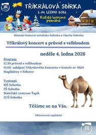Srdečně vás zveme na Tříkrálový koncert a průvod s velbloudem, který se uskuteční 04.01.2026 v Sobotce v kostele sv. Máří Magdalény. Průvod s velbloudem začíná od 12:30 hodin u kostela.