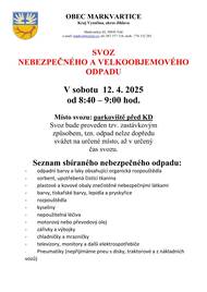 Vážení spoluobčané, v sobotu 2.11.2024 od 8:45 - 9:00hod. proběhne svoz velkoobjemového a nebezpečného odpadu na parkovišti před KD. Bližší info na www.obecmarkvartice.cz, na ÚD a v obchodě.