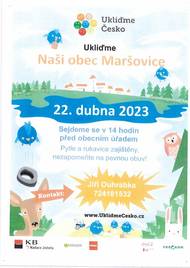 Dne 22.4.2023 od 14:00 hod. proběhne v naší obci akce ,, Ukliďme Česko". Pracovní pomůcky a pytle na odpad budou k dispozici při zahájení úklidu. Po skončení úklidu dojde k zakončení celé akce na hřišti posezením u ohýnku s opékáním buřtů. Všichni jste srdečně zváni.