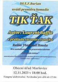 DS E.F.Burian uvádí premiéru komedie ,,TIK ŤAK", které se koná dne 12.11.2023 od 18.00 hod. Jedná se o komedii z prostředí čekárny u doktora. Pacienti se scházejí a začíná se rozbíhat děj událostí.
