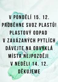 V pondělí 15. prosince 2025 se uskuteční svoz plastového odpadu. Žádáme všechny občany, aby připravili plastový odpad do zavázaných pytlů a umístili je na obvyklá místa do neděle 14. prosince. Děkujeme za spolupráci a ohleduplnost k životnímu prostředí.
