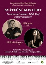 Mecholupy: Dne 7.3.2026 od 17:00hod.se uskutecni na sale zamku v Mecholupech koncert s pisnemi Edith Piaf a Hany Hegerove.Vstupenky na korinkova@lzs-mecholupy.cz, tel. 603835777.Cena vstupenky 180,-Kc.Srdecne Vas zveme