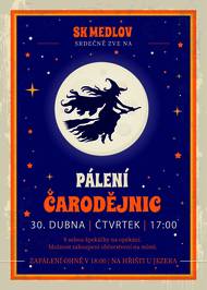 SK Medlov Vás srdečně zve ve čtvrtek 30.dubna od 17.00 do areálu fotbalového hřiště na tradiční "Pálení čarodějnic". Pálení čarodějnic, dříve též filipojakubská noc, je lidový zvyk spojený s pálením ohňů a vírou v čarodějnice, který se odehrává v noci ze 30. dubna na 1. května. Buřty s sebou, bohaté občerstvení zajištěno :-)