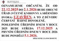 Oznamujeme občanům, že od 22.12.2025 do 2.1.2026 bude OÚ Mělnické Vtelno (včetně knihovny a sběrného dvora) uzavřen.