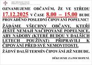Oznamujeme občanům, že 17.12.2025 v čase 8:00 - 15:00 proběhne dočipování neočipovaných popelnic.