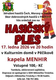SDH Pěčíkov Vás srdečně zve na „Hasičský ples“. Uskuteční se v sobotu 17. ledna ve 20 hodin v kulturním domě v Pěčíkově. Hraje kapela Menhir a vstupné je 100,- Kč.