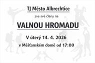 TJ Město Albrechtice zve své členy na valnou hromadu. Valná hromada se uskuteční v úterý 14. dubna 2026 od 17:00 v měšťanském domě v Městě Albrechticích.