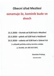 Vážení občané, v pondělí 4.8.2025 ve 12,30 hod navštíví hřbitov v Mezilesí kameníci z firmy DS kamen ( tel: 722906070). Budou poskytovat bezplatné konzultace a přijímat objednávky na opravy hrobů včetně zlacení a přípisů.