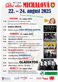 Vážení občania, srdečne Vás pozývame na XIII. ročník Dní obce Michalová 2025, ktorý sa uskutoční od 22. augusta - 24. augusta 2025. ZMENA MIESTA KONANIA: IHRISKO ZA ULIČKOU! Na podujatí sa bude kamerovať a fotografovať. Zmena programu vyhradená.