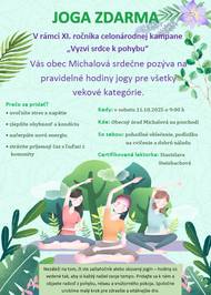 V rámci 11. ročníka celonárodnej kampane „Vyzvi srdce k pohybu", vás obec Michalová srdečne pozýva na pravidelné hodiny jogy pre všetky vekové kategórie.