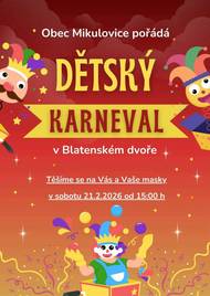 Obec Mikulovice srdečně zve všechny děti i rodiče na Dětský karneval, který se uskuteční v sobotu 21. 1. 2026 od 15:00 v Blatenském dvoře.