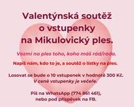 Zapojte se do naší valentýnské soutěže a vyhrajte vstupenky na Mikulovický ples! Chcete vzít na ples někoho, koho máte rádi? Napište nám, kdo to je, a zařadíme vás do slosování o 10 vstupenek v hodnotě 300 Kč. Součástí vstupenky je také večeře. Jak se zapojit viz přiložený leták.
