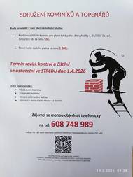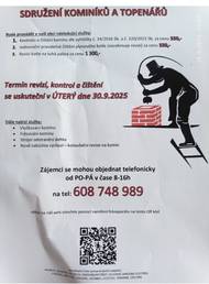 V sobotu 24.5. 2025 bude Sdružení kominíků a topenářů provádět v naší obci čištění komínů a revize kotlů. Zájemci se mohou hlásit na 608 748 989 .