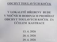V lokalitě Hřebeny bude ve večerních a nočních hodinách probíhat odchyt toulavých koček za účelem kastrace a to 13.4. , 20.4. a 29.4. .
