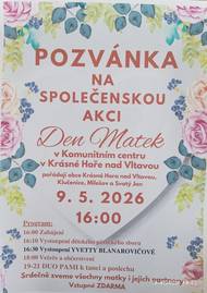 V sobotu 9. května od 16 hodin se bude konat v Komunitním centru v Krásné Hoře Den matek. Srdečně zveme. Plakát v příloze.