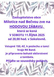 Zveme všechny občany na tradiční Hodovou zábavu, která se koná v sobotu 11.10.2025 od 20,00 hod v Sokolovně. Je přichystána bohatá tombola a občerstvení. Hraje kapela RK Band. Přijďte se pobavit na Milotické hody. V neděli pak pokračujeme Hodovým fotbálkem "svobodní proti ženatým" na výletišti Sokolka od 14,00 hod.