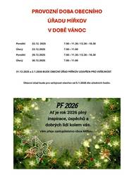 Obecní úřad Mířkov informuje o úředních hodinách v období kolem Vánoc. V pondělí 22. a 29. prosince 2025 bude úřad otevřen od 7.00 do 11.30 a od 12.30 do 16.30. V úterý 23. a 30. prosince 2025 pak od 7.00 do 11.00. Dne 31. prosince 2025 a 2. ledna 2026 bude úřad uzavřen pro veřejnost.