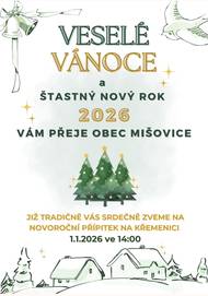 Příjemné prožití vánočních svátků, hodně štěstí, zdraví a spokojenosti v Novém roce 2026, přeje Obec Mišovice. Již tradičně Vás srdečně zveme na novoroční přípitek na Křemenici 1.1.2026 od 14:00 hod.