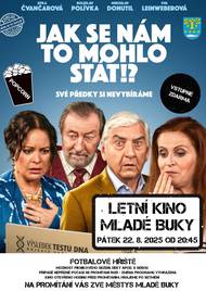 Pozvánka do Letního kina V pátek 22.8.2025 od 20:45 promítáme poslední Letní kino této sezóny. Promítat se bude nová česká komedie JAK SE NÁM TO MOHLO STÁT!? Těšíme se na Vás... na fotbalovém hřišti v Mladých Bukách.