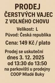 PRODEJ ČERSTVÝCH VAJEC Z VOLNÉHO CHOVU Velikost: L Původ: Česká republika Cena: 149 Kč / plato (30 ks) Prodej se uskuteční dnes 3. 12. 2025 od 13:30 do 13:50 na parkovišti u prodejny COOP Mladé Buky
