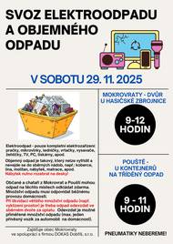 V sobotu, dne 29.11.2025, se v Mokrovratech a Pouštích uskuteční sběr elektroodpadu a objemného odpadu. Občané mohou zdarma odevzdat elektrozařízení a objemný odpad v určených časech a místech.