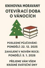 Knihovna oznamuje, že poslední půjčování knih bude 22.12.2025 a zahájení v roce 2026 bude 5.1.2026.