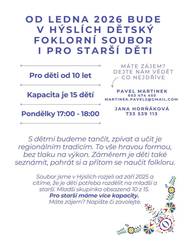 Od ledna tohoto roku v Hýslích funguje dětský folklorní soubor i pro starší děti. Příjímáme děti od 10 let.Zkoušky se konají každé pondělí od 17:00 do 18:00 hodin. Ozvěte se Pavlovi Martínkovi na martinek.pavel2@gmail.com nebo na telefonní číslo 603 474 450.