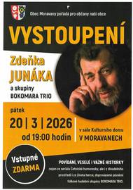 Obec Moravany pořádá pro občany naší obce Vystoupení Zdeňka Junáka a skupiny BOKOMARA TRIO. Všichni jste srdečně zváni.