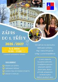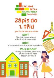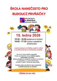 Zveme budoucí prvňáčky a jejich rodiče k návštěvě školy na Kostelním náměstí. Hravou formou se děti seznámí se školním prostředím a vyzkouší si, co je ve škole čeká. 15. ledna 2026 15:30–16:00 prezence a tvoření 16:00–17:30 zábavná výuka ČJ, MAT, PRV S sebou stačí vzít chuť si něco vyzkoušet a přibalit přezůvky do batůžku. Těšíme se na Vás.